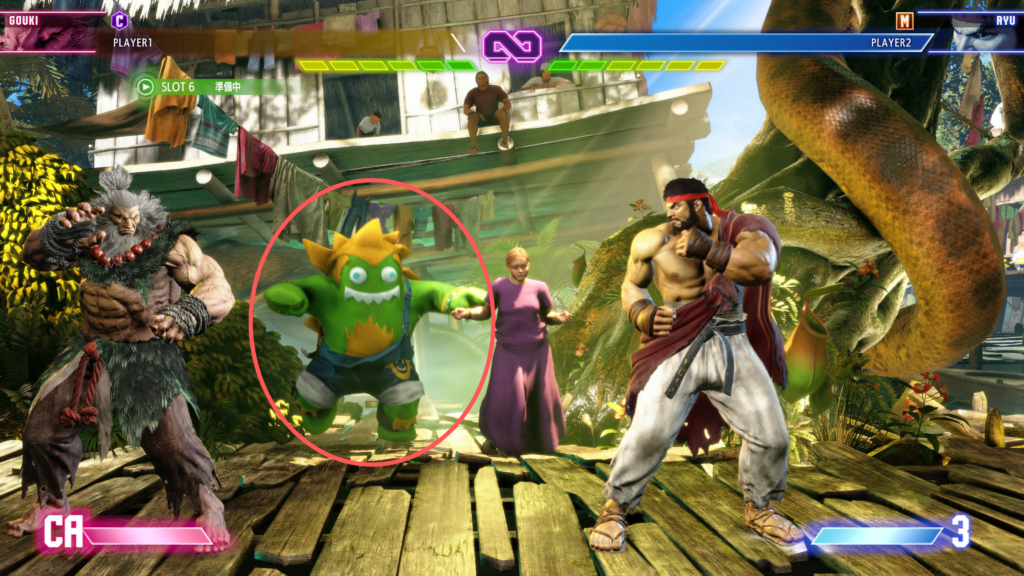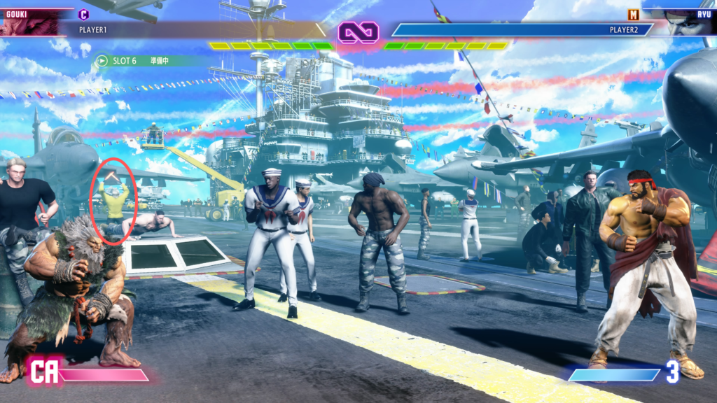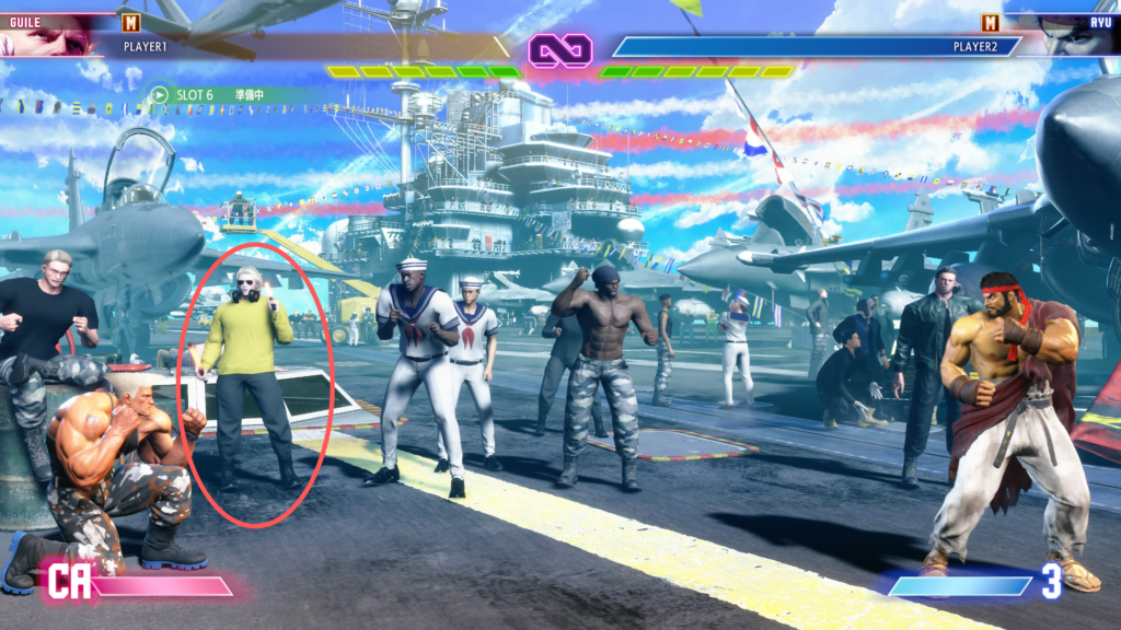 ちなみに、ガイルがファイターとして出場していると、戦闘機は最初からそこにある状態になり、誘導をしていた人が手前で観戦するようになる。