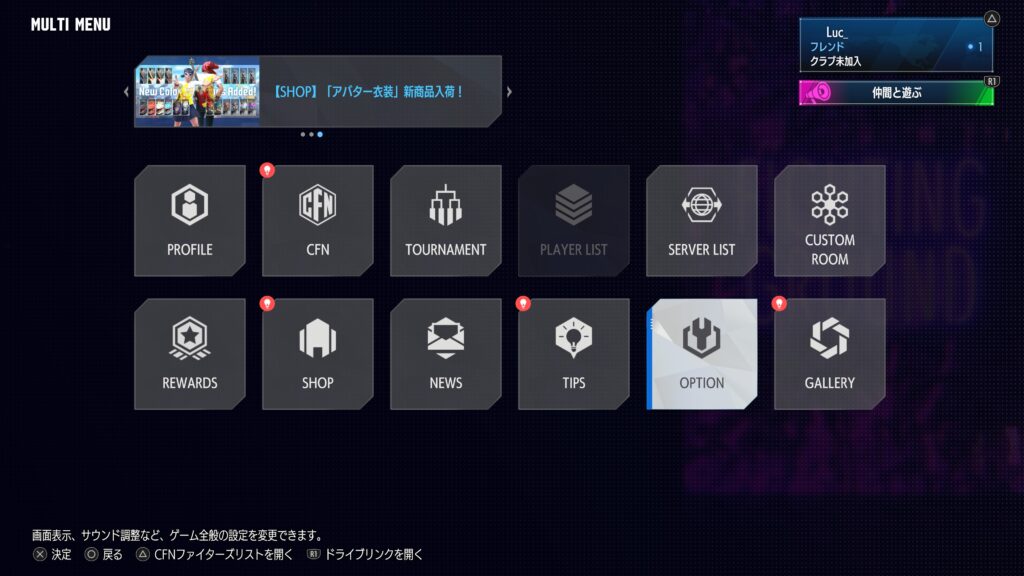 1,「MULTI MENU」へ行き、「OPTION」を開く。