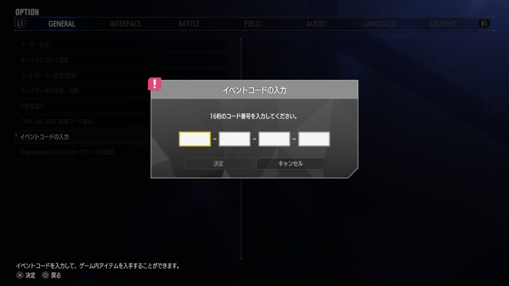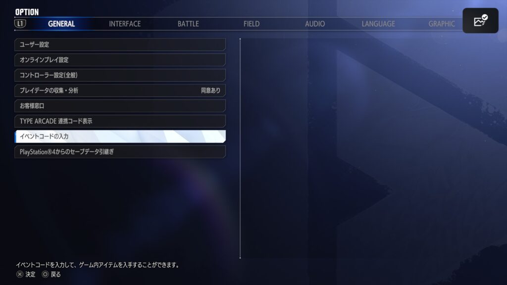 2,「GENERAL」にある「イベントコードの入力」を選択する。