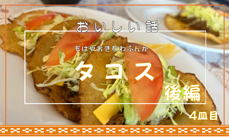 お昼からタコスばかり食べ歩いて晩御飯が食べられなくなったのを知人に話すと、『ええ!沖縄に行ったのにもったいない、せめて沖縄そばでも食べないと』というパターンと、『ええ!、沖縄でないとできない食べ歩きですね、楽しそう』のパターンだ。僕は「初オキナワじゃなかったから、遊びでお腹いっぱいになったわ」と、どちらにも相槌を打つような話で返す。もちろん、”あの日のタコス” は、今でも格別の思い出だ。