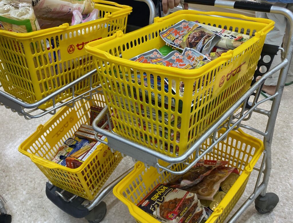うちはサンエーカードを保有するナイチャーなので、ユニオンやリュウボウに行くことは、そもそも少ないのですが、かねひでやジミーにはたまに寄る事があります。あっ!と気づくと上のカゴも下のカゴもいっぱいになりましたね。しかも、カートはすでに2台目。
