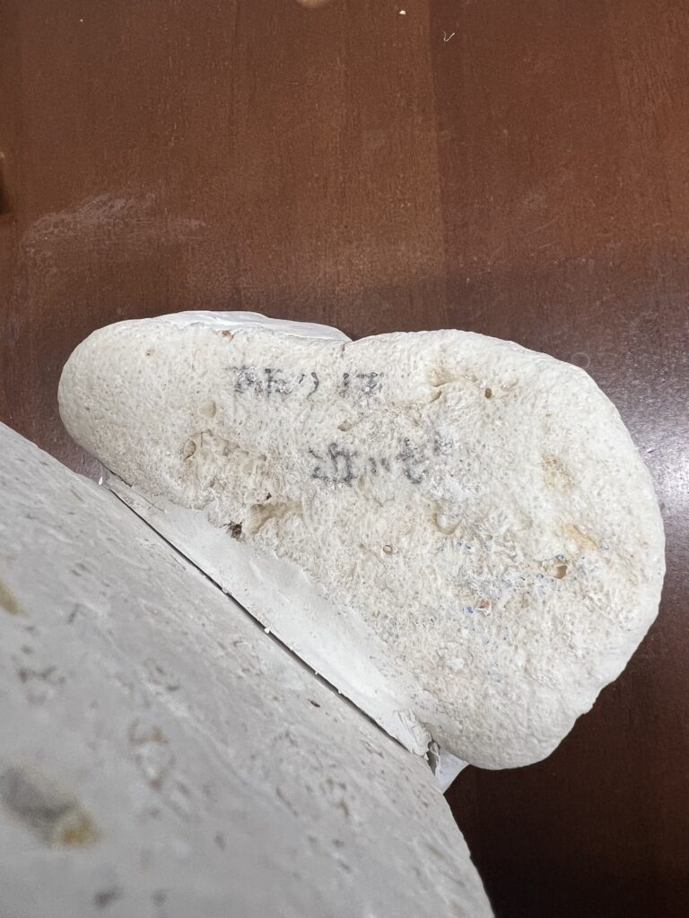 実は、市販されているものを買うつもりだったのですが、妻に言われて琉球石灰岩にアクリルペンキで文字を書き、紙粘土とあたり珊瑚を土台にしました。