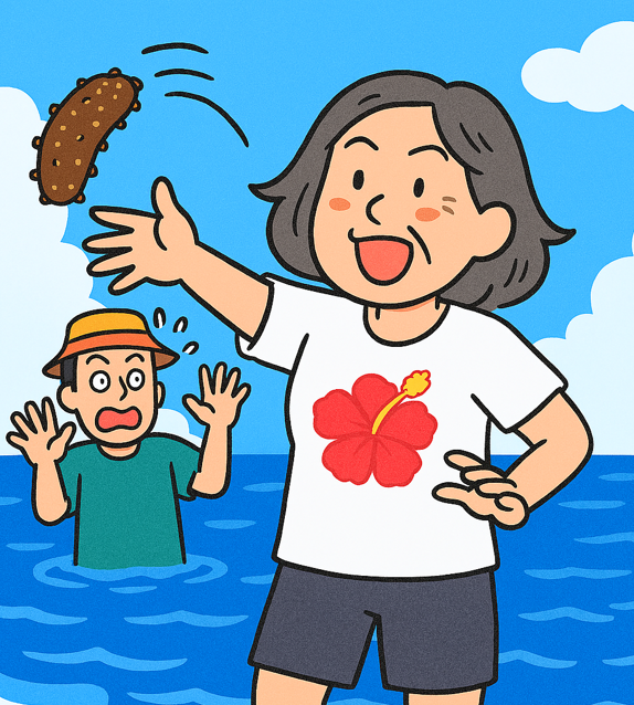 逃げ惑う僕や友人たちに、大笑いしながら放り投げますが、足の甲スイングでは水の抵抗もあって僕らには命中しません。ウミウシですら素手で捕まえる妻ですから、最後はナマコを掴んで僕に投げつけます。実は、わちゃわちゃと騒ぎ立てるのが楽しくて透明な海でバカ騒ぎしていたのですが、「おいおい、◯◯コで遊ぶオバサンにしか見えへんぞ!」のひと言でジャイアンは鎮まりました。